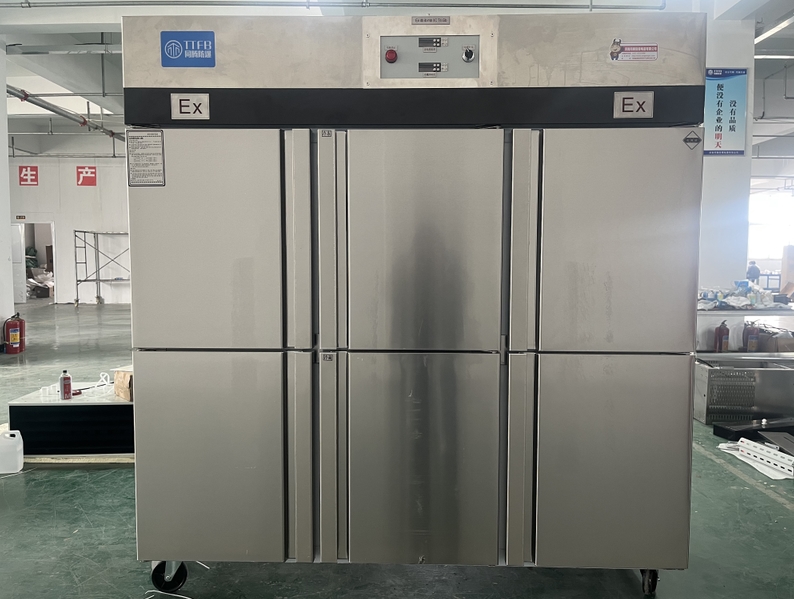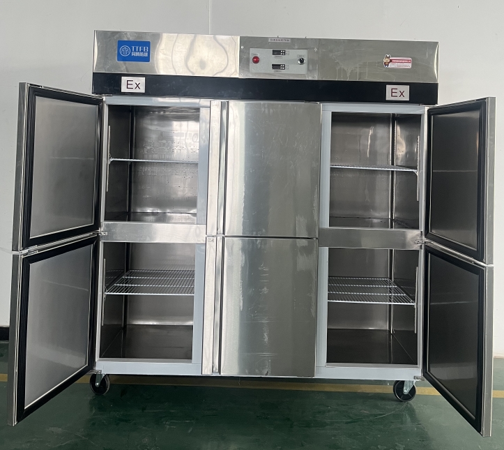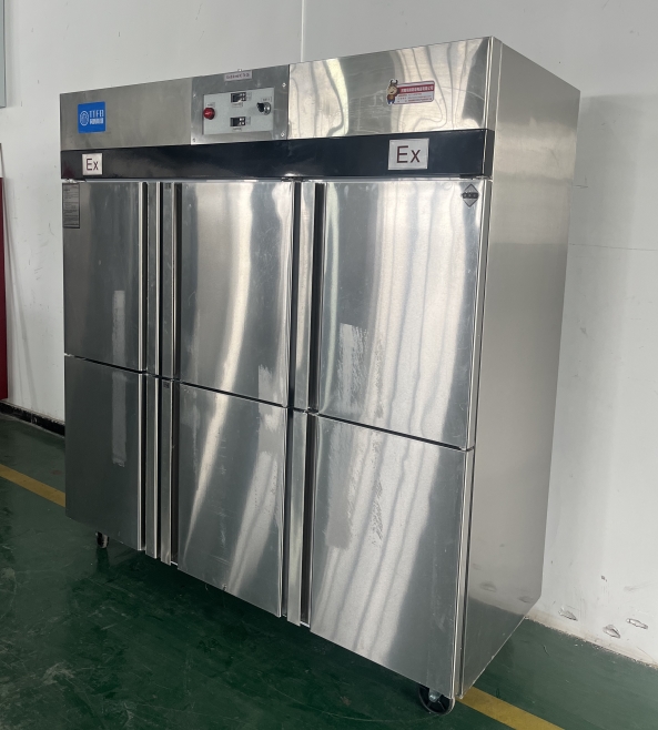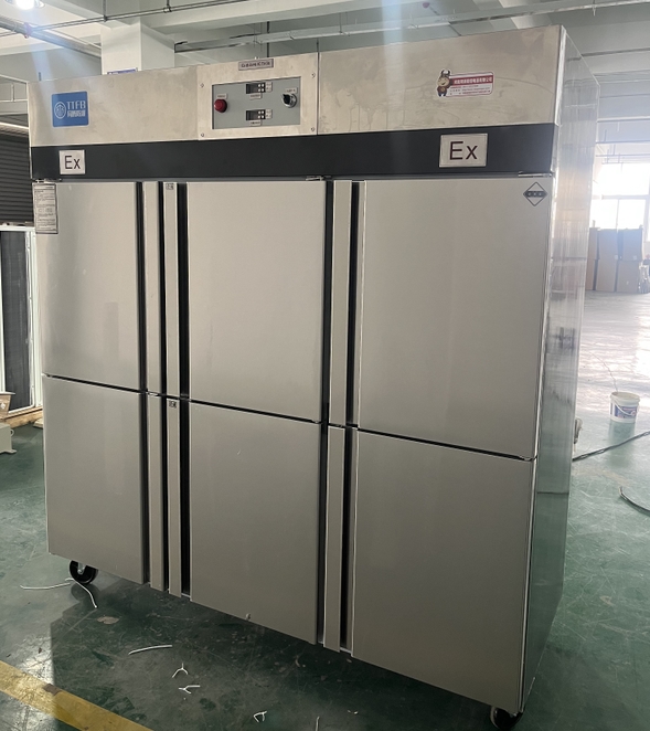 我公司生產(chǎn)的六門不銹鋼同騰防爆冰箱(以下簡稱防爆冰箱),產(chǎn)品防爆要求是根據(jù)GB3836.1-2010《爆炸性環(huán)境 第1部分:設(shè)備 通用要求》、GB3836.2-2010《爆炸性環(huán)境 第2部分:由隔爆外殼“d”保護(hù)的設(shè)備》、GB3836.4-2010《爆炸性環(huán)境 第4部分:由本質(zhì)安全型“i”保護(hù)的設(shè)備》、GB3836.9-2006《爆炸性氣體環(huán)境用電氣設(shè)備 第9部分 澆封型“m”》及GB3836.15-2017《爆炸性氣體環(huán)境用電氣設(shè)備 第15部分:電氣裝置的設(shè)計、選型和安裝》的規(guī)定制成防爆結(jié)構(gòu),經(jīng)國家授權(quán)的質(zhì)量監(jiān)督檢驗部門檢驗合格,其防爆標(biāo)志為ExdbibmbⅡCT4 Gb。適用于工廠存在或可能存在ⅡA、ⅡB級、ⅡC,T1~T4組可燃性氣體、蒸氣與空氣混合形成的爆炸危險1區(qū)或2區(qū)場所。該產(chǎn)品經(jīng)國家防爆電氣產(chǎn)品質(zhì)量監(jiān)督檢驗中心檢驗合格并取得了防爆合格證。空調(diào)機(jī)廣泛適用于石油、化工、冶金、制藥和國防工業(yè)等空氣中存在爆炸性氣體混合物的自封閉的室內(nèi)之用。